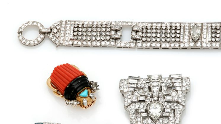 "The decorative jewellery from the Art Deco period of the 1920-30s is extremely sought after. They speak to the fashion-conscious women who want to display a personal style with on attention to detail. At the upcoming auction, there is a nice selection of these pieces of jewellery – from impressive diamond bracelets and brooches to an exotic coral and diamond clips from Cartier, depicting a scarab," says Katrin Mikkelsen Sørensen from Bruun Rasmussen's jewellery department.