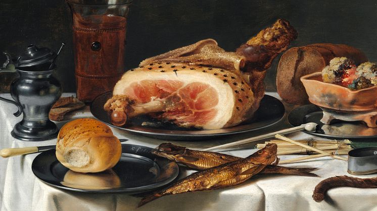 The painting is typical of Claesz' early production from the mid-1620s. A masterful composition with strong contrasts between the white tablecloth and the pitch-black background that are intercut in the middle by the pink ham. With the crossed straw and herring he has created depth and compositional balance. Claesz has explored the shape, colour and texture of different elements in the painting, and one can clearly sense the difference between the fat ham, the shining herring, the hot pieces of coal and the matte tin.