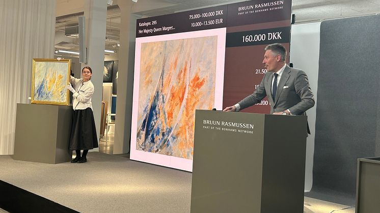 All eyes were on the podium when a painting by H.M. Queen Margrethe went under the hammer at Bruun Rasmussen in Lyngby on Tuesday evening. The work was estimated at DKK 75,000–100,000 but exceeded the estimate, fetching a staggering hammer price of DKK 211,200 (including buyer’s premium).