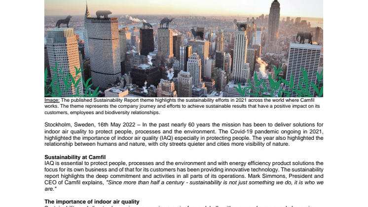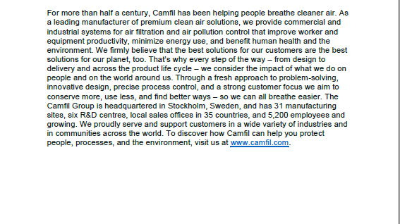 For sixty years, Camfil has been helping people breathe cleaner air. As a leading manufacturer of premium clean air solutions, we provide commercial and industrial systems for air filtration and air pollution control that improve worker and equipment productivity, minimize energy use, and benefit human health and the environment. We firmly believe that the best solutions for our customers are the best solutions for our planet, too. That’s why every step of the way – from design to delivery and across the product life cycle – we consider the impact of what we do on people and on the world around us. Through a fresh approach to problem-solving, innovative design, precise process control, and a strong customer focus we aim to conserve more, use less, and find better ways – so we can all breathe easier.