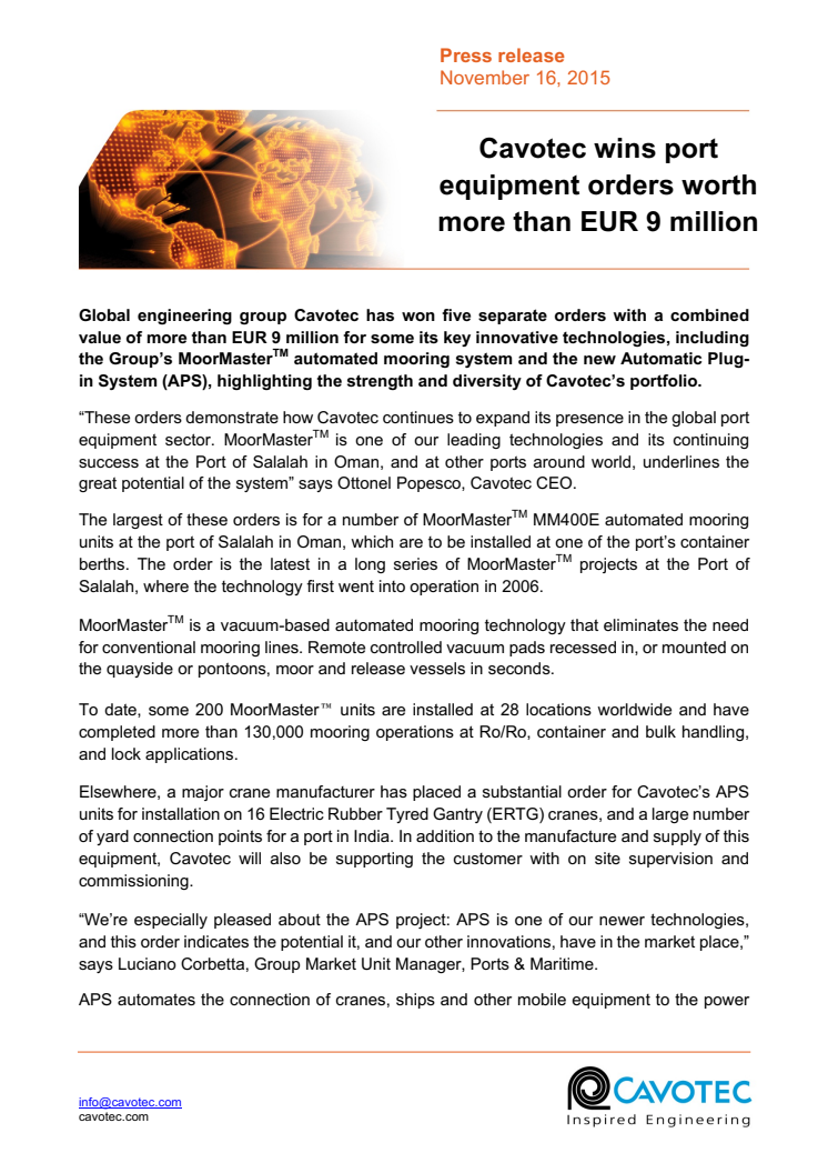 News of five separate orders with a combined value of more than EUR 9 million for some of its key innovative technologies, including the Group's MoorMaster automated mooring system and the new Automatic Plug-in System (APS), highlighting the strength and diversity of Cavotec's portfolio.
