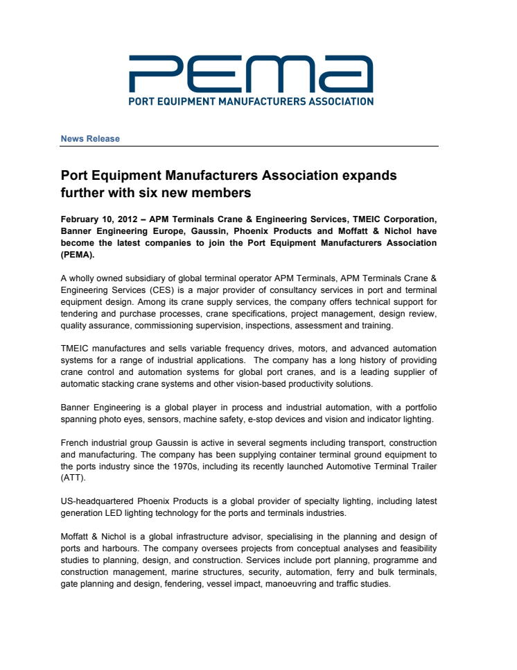 The Port Equipment Manufacturers Association (PEMA) has announced that six new companies have joined the organisation, taking its total membership to 60. The new members are APM Terminals Crane & Engineering Services, TMEIC Corporation, Banner Engineering Europe, Gaussin, Phoenix Products and Moffatt & Nichol.