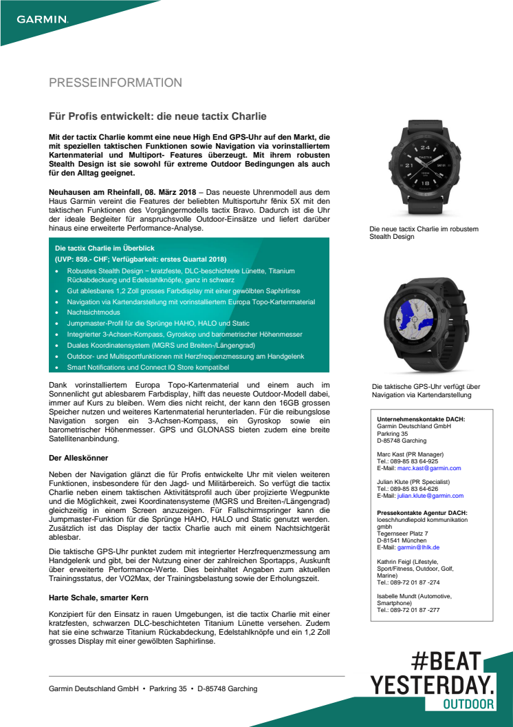 Mit der tactix Charlie kommt eine neue High End GPS-Uhr auf den Markt, die mit speziellen taktischen Funktionen sowie Navigation via vorinstalliertem Kartenmaterial und Multiport- Features überzeugt. Mit ihrem robusten Stealth Design ist sie sowohl für extreme Outdoor Bedingungen als auch für den Alltag geeignet.