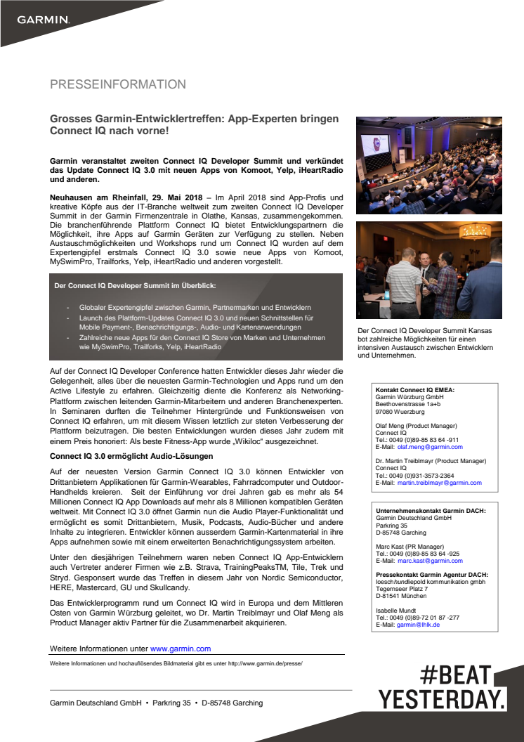 Garmin veranstaltet zweiten Connect IQ Developer Summit und verkündet das Update Connect IQ 3.0 mit neuen Apps von Komoot, Yelp, iHeartRadio und anderen.