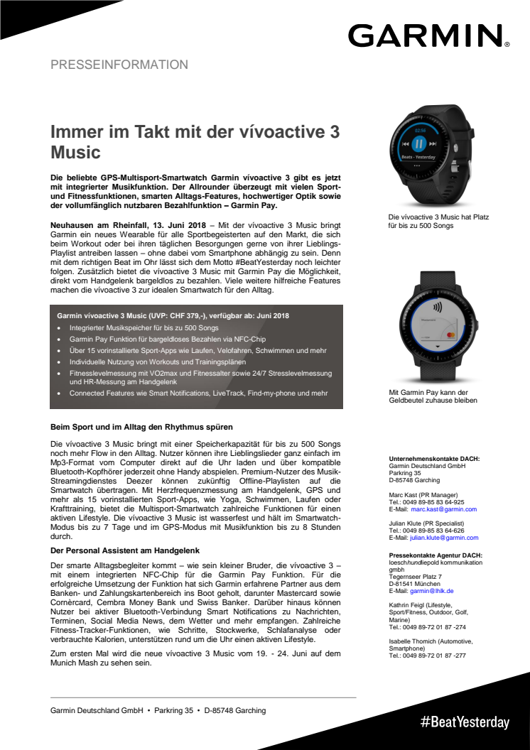 Die beliebte GPS-Multisport-Smartwatch Garmin vívoactive 3 gibt es jetzt mit integrierter Musikfunktion. Der Allrounder überzeugt mit vielen Sport- und Fitnessfunktionen, smarten Alltags-Features, hochwertiger Optik sowie der vollumfänglich nutzbaren Bezahlfunktion – Garmin Pay.