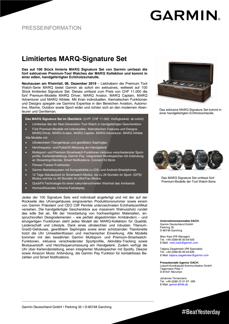 Das auf 100 Stück limierte MARQ Signature Set von Garmin umfasst die fünf exklusiven Premium-Tool Watches der MARQ Kollektion und kommt in einer edlen, handgefertigten Echtholzschatulle.