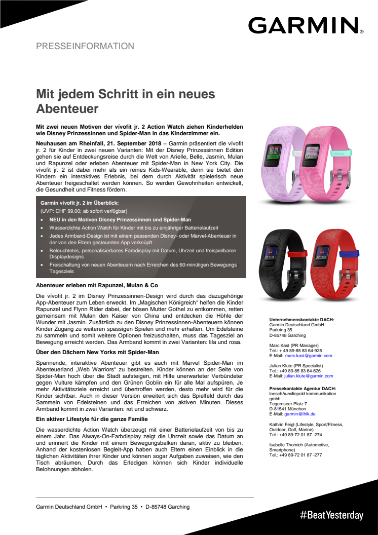 Mit zwei neuen Motiven der vívofit jr. 2 Action Watch ziehen Kinderhelden wie Disney Prinzessinnen und Spider-Man in das Kinderzimmer ein.