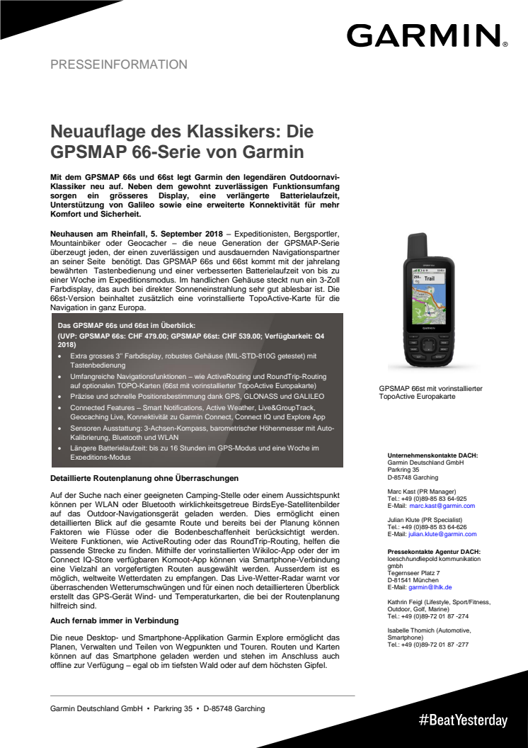 Mit dem GPSMAP 66s und 66st legt Garmin den legendären Outdoornavi- Klassiker neu auf. Neben dem gewohnt zuverlässigen Funktionsumfang sorgen ein grösseres Display, eine verlängerte Batterielaufzeit, Unterstützung von Galileo sowie eine erweiterte Konnektivität für mehr Komfort und Sicherheit.