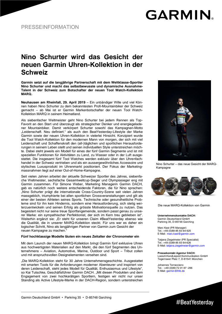 Garmin setzt auf die langjährige Partnerschaft mit dem Weltklasse-Sportler Nino Schurter und macht das selbstbewusste und dynamische Ausnahme-Talent in der Schweiz zum Botschafter der neuen Tool Watch-Kollektion MARQ.