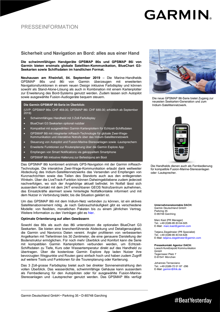 Die schwimmfähigen Handgeräte GPSMAP 86s und GPSMAP 86i von Garmin bieten erstmals globale Satelliten-Kommunikation, BlueChart G3-Seekarten sowie Schiffsdaten im handlichen Format.