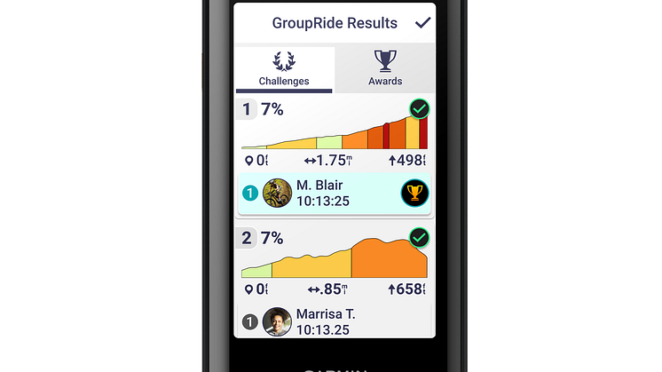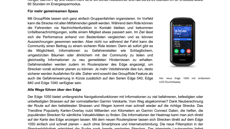 Mit GroupRide lassen sich ganz einfach Gruppenfahrten organisieren. Im Vorfeld kann die Strecke mit allen Mitfahrenden geteilt werden. Während dem Ride können die Fahrenden via Nachrichtenfunktion in Kontakt bleiben und bekommen Unfallbenachrichtigungen, sollte einem Mitglied etwas passiert sein. Im Ziel lässt sich die Performance anhand von Bestenlisten vergleichen und es können Auszeichnungen gewonnen werden. Aber nicht nur während der Fahrt kann die Community einen Beitrag zu einem sicheren Ride leisten: Denn ab sofort gibt es die Möglichkeit, Informationen zu Gefahrenstellen wie Schlaglöchern, umgestürzten Bäumen oder ähnlichem mit der Community zu teilen und gleichzeitig Informationen zu neu gemeldeten Hindernissen zu erhalten. Gefahrenstellen werden zudem im Routenplaner des Edge angezeigt, um Strecken vorab sicherer planen zu können. Je mehr Velofahrende dies tun, desto sicherer werden Ausfahrten für alle. Daher wird sowohl das GroupRide Feature als auch die Gefahrenwarnung in Kürze zusätzlich auf den Serien Edge 540, Edge 840 und Edge 1040 verfügbar sein.