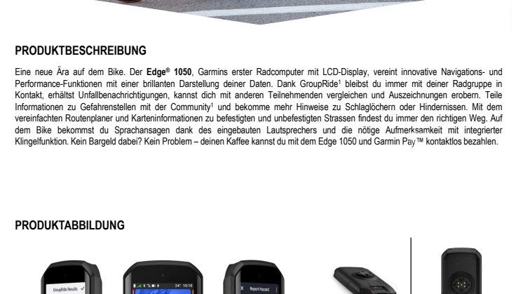 Eine neue Velo-Ära hat begonnen: Der Edge 1050, Garmins erster Velocomputer mit LCD-Touchdisplay, vereint innovative Navigations-, Community- und Performance-Funktionen mit einer brillanten Darstellung.