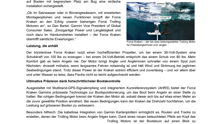 „Ob im Salzwasser oder in Binnengewässern, mit erweiterten Montageoptionen und neuen Funktionen knüpft der Force Kraken an den Erfolg unserer bisherigen Force Trolling Motoren an“, so Dan Bartel, Garmin Vice President of Global Consumer Sales. „Einzigartige Power und Langlebigkeit und noch dazu im Handumdrehen installiert – der Force Kraken übertrifft sämtliche Erwartungen.“