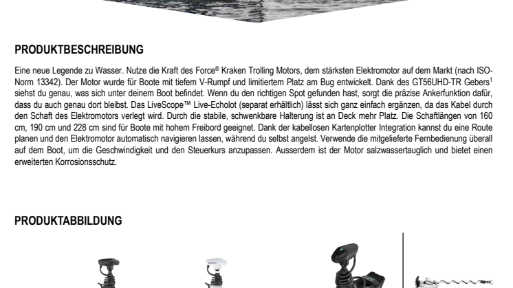 Während der Force Kraken Trolling Motor seine Premiere Mitte Juli auf der International Convention of Allied Sportfishing Trades (ICAST) in Orlando, Florida feiert, ist der Motor hierzulande voraussichtlich ab Oktober 2023 erhältlich. Verfügbar sein wird der Force Kraken in Weiss (mit Schaftlängen von 160 cm, 190 cm und 228 cm) sowie in Schwarz (mit Schaftlängen von 160 cm und 190 cm). Die schwarzen Modelle sind zusätzlich mit einem GT56UHD-TR-Geber ausgestattet. Je nach Ausführung liegen die UVP zwischen CHF 4‘499.90 und CHF 5‘199.90.