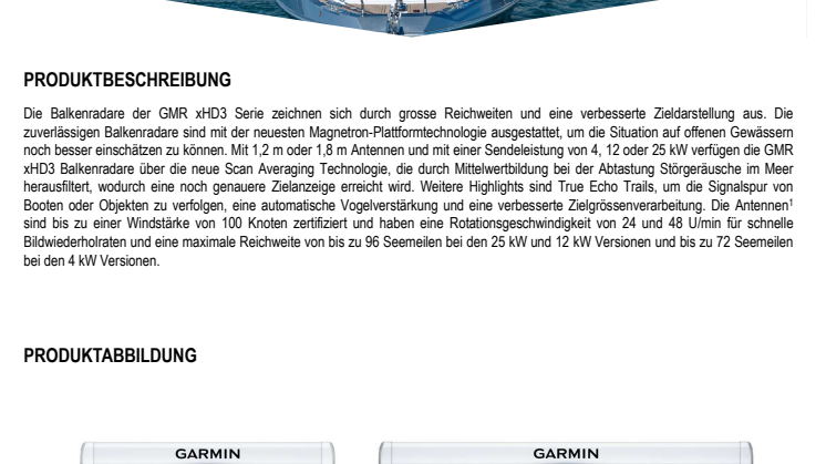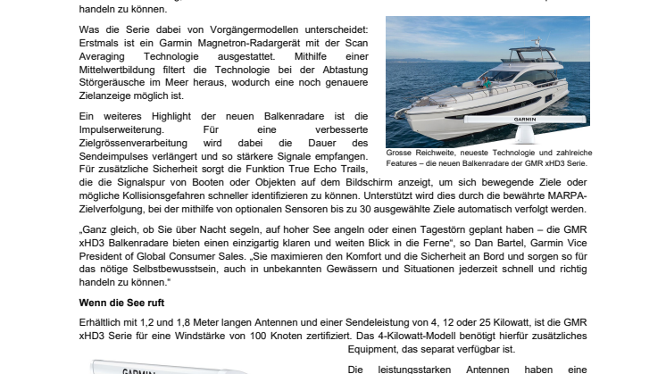 „Ganz gleich, ob Sie über Nacht segeln, auf hoher See angeln oder einen Tagestörn geplant haben – die GMR xHD3 Balkenradare bieten einen einzigartig klaren und weiten Blick in die Ferne“, so Dan Bartel, Garmin Vice President of Global Consumer Sales. „Sie maximieren den Komfort und die Sicherheit an Bord und sorgen so für das nötige Selbstbewusstsein, auch in unbekannten Gewässern und Situationen jederzeit schnell und richtig handeln zu können.“