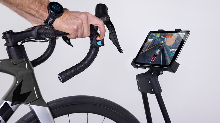 - · Zwift Click lässt sich an jeder Stelle, an jedem Lenker befestigen und ermöglicht so kabelloses, virtuelles Schalten in Zwift.