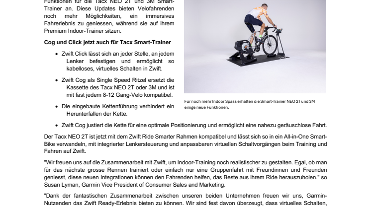 "Wir freuen uns auf die Zusammenarbeit mit Zwift, um Indoor-Training noch realistischer zu gestalten. Egal, ob man für das nächste grosse Rennen trainiert oder einfach nur eine Gruppenfahrt mit Freundinnen und Freunden geniesst, diese neuen Integrationen können den Fahrenden helfen, das Beste aus ihrem Ride herauszuholen." so Susan Lyman, Garmin Vice President of Consumer Sales and Marketing.