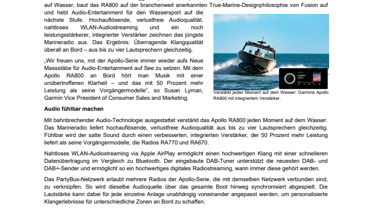 „Wir freuen uns, mit der Apollo-Serie immer wieder aufs Neue Massstäbe für Audio-Entertainment auf See zu setzen. Mit dem Apollo RA800 an Bord hört man Musik mit einer unübertroffenen Klarheit – und das mit 50 Prozent mehr Leistung als seine Vorgängermodelle”, so Susan Lyman, Garmin Vice President of Consumer Sales and Marketing.