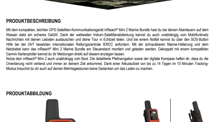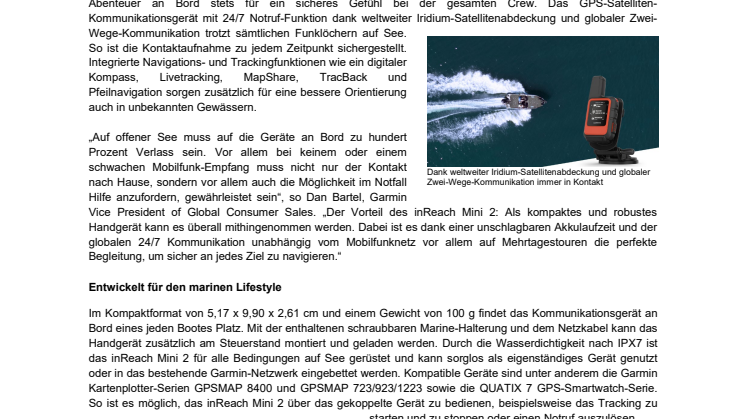 „Auf offener See muss auf die Geräte an Bord zu hundert Prozent Verlass sein. Vor allem bei keinem oder einem schwachen Mobilfunk-Empfang muss nicht nur der Kontakt nach Hause, sondern vor allem auch die Möglichkeit im Notfall Hilfe anzufordern, gewährleistet sein“, so Dan Bartel, Garmin Vice President of Global Consumer Sales. „Der Vorteil des inReach Mini 2: Als kompaktes und robustes Handgerät kann es überall mithingenommen werden. Dabei ist es dank einer unschlagbaren Akkulaufzeit und der globalen 24/7 Kommunikation unabhängig vom Mobilfunknetz vor allem auf Mehrtagestouren die perfekte Begleitung, um sicher an jedes Ziel zu navigieren.“