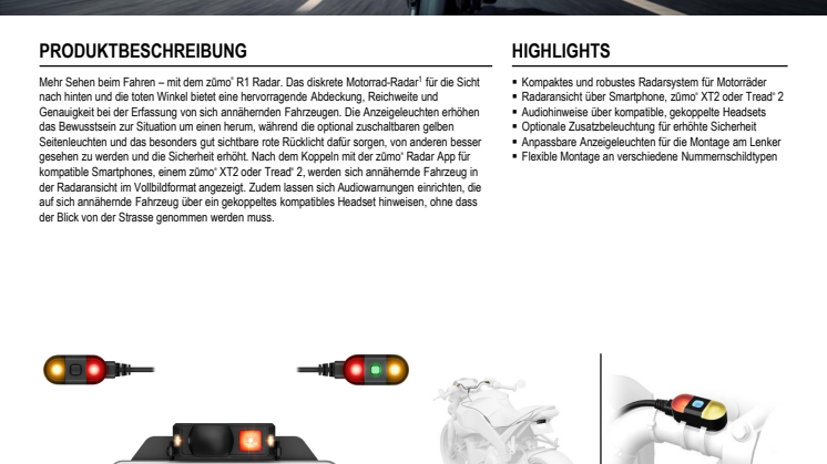 Das zūmo R1 Radar ist zu einem empfohlenen Verkaufspreis von CHF 599.90 erhältlich und umfasst das Radar, die Anzeigeleuchten für den Lenker sowie einen Montagesatz.