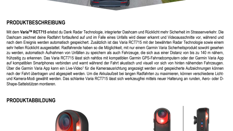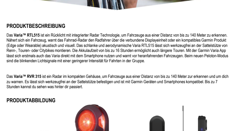 Mit der Dreierkombination aus innovativer Radartechnologie, integrierten Rücklichtern und einer verbauten Dashcam in der Varia-Produktreihe sorgt Garmin auch in diesem Frühling wieder für mehr Sicherheit auf den Strassen. Noch sorgenfreier unterwegs ist, wer zudem einen Edge-Fahrradcomputer mit LiveTracking und Unfallerkennung einsetzt.
