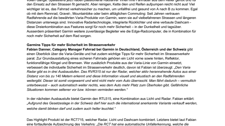 Fabian Danner, Category Manager Fahrrad bei Garmin in Deutschland, Österreich und der Schweiz gibt einen Überblick über die Varia-Geräte und hat zudem wichtige Tipps für mehr Sicherheit im Strassenverkehr parat: Zur Grundausstattung eines sicheren Fahrrads gehören ein Licht vorne sowie hinten, Reflektor, funktionsfähige Klingel und Bremsen. Wer zusätzlich Produkte aus der Varia-Linie von Garmin einsetzt, verbessert die individuelle Sicherheit im Strassenverkehr deutlich, davon ist Fabian ist überzeugt: „Den Varia Radar gibt es in drei Ausbaustufen. Das RVR315 ist nur der Radar, welcher aktiv herannahende Autos aus einer Distanz von bis zu 140 Metern erkennt und diese Information visuell und akustisch an den Radfahrenden weitergibt. Dieser ist somit vorgewarnt und wird nicht mehr vom Auto überrascht. Man fährt dadurch – vermutlich unterbewusst – auch automatisch weiter rechts, was dem Auto mehr Platz zum Überholen gibt. Gefährliche Situationen kommen seltener vor bzw. können vermieden werden.“