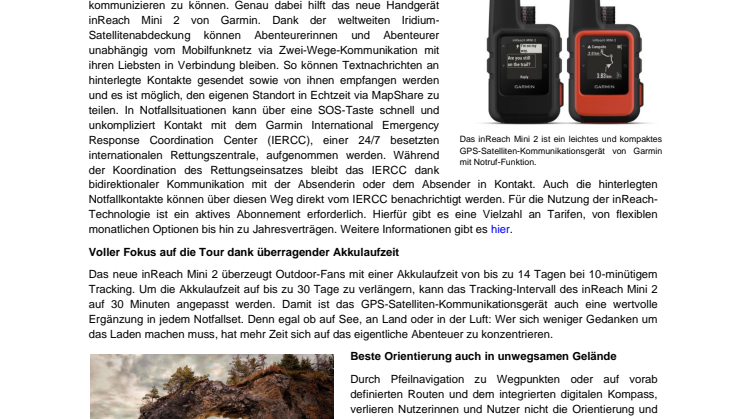 Neuhausen am Rheinfall, 02. Februar 2022 – Ob unterwegs in Wäldern oder im schroffen Gelände – bei Outdoor-Abenteuern kann viel passieren. Umso wichtiger ist es, jederzeit mit anderen Personen kommunizieren zu können. Genau dabei hilft das neue Handgerät inReach Mini 2 von Garmin. Dank der weltweiten Iridium-Satellitenabdeckung können Abenteurerinnen und Abenteurer unabhängig vom Mobilfunknetz via Zwei-Wege-Kommunikation mit ihren Liebsten in Verbindung bleiben. So können Textnachrichten an hinterlegte Kontakte gesendet sowie von ihnen empfangen werden und es ist möglich, den eigenen Standort in Echtzeit via MapShare zu teilen. In Notfallsituationen kann über eine SOS-Taste schnell und unkompliziert Kontakt mit dem Garmin International Emergency Response Coordination Center (IERCC), einer 24/7 besetzten internationalen Rettungszentrale, aufgenommen werden. Während der Koordination des Rettungseinsatzes bleibt das IERCC dank bidirektionaler Kommunikation mit der Absenderin oder dem Absender in Kontakt. Auch die hinterlegten Notfallkontakte können über diesen Weg direkt vom IERCC benachrichtigt werden. Für die Nutzung der inReach-Technologie ist ein aktives Abonnement erforderlich. Hierfür gibt es eine Vielzahl an Tarifen, von flexiblen monatlichen Optionen bis hin zu Jahresverträgen. Weitere Informationen gibt es hier.