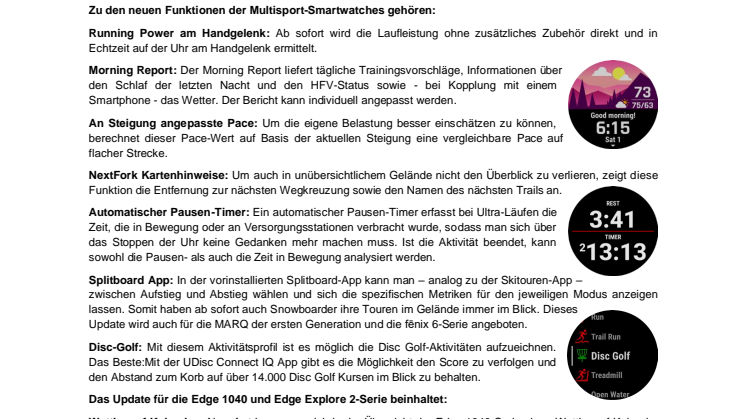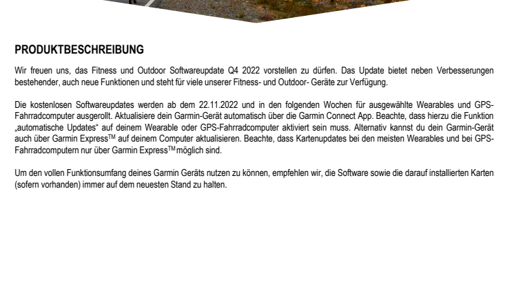 Die kostenlosen Software-Updates werden ab sofort auf kompatiblen Geräten bereitgestellt, weitere Updates folgen in Kürze. Die Smartwatches oder Radcomputer lassen sich aktualisieren, indem automatische Updates auf dem Gerät aktiviert sind oder Garmin Express verwendet wird.