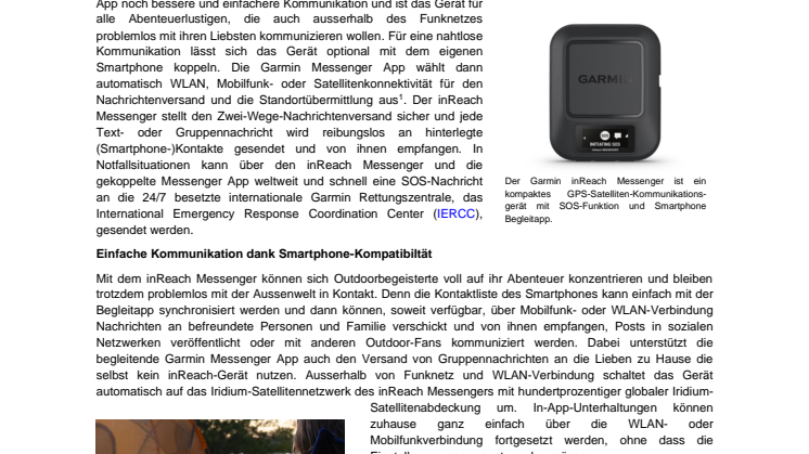 Neuhausen am Rheinfall, 27. September 2022 – Tief in den Alpen oder in abgelegenen Wäldern - Outdoor-Fans benötigen Ausrüstung, die ihnen Sicherheit bietet. Schon seit Jahren sorgt Garmin mit der inReach-Technologie in seinen Geräten für genau dieses sichere Gefühl – vor allem ausserhalb des Mobilfunknetzes. Der inReach Messenger ermöglicht dank der neuen Garmin Messenger App noch bessere und einfachere Kommunikation und ist das Gerät für alle Abenteuerlustigen, die auch ausserhalb des Funknetzes problemlos mit ihren Liebsten kommunizieren wollen. Für eine nahtlose Kommunikation lässt sich das Gerät optional mit dem eigenen Smartphone koppeln. Die Garmin Messenger App wählt dann automatisch WLAN, Mobilfunk- oder Satellitenkonnektivität für den Nachrichtenversand und die Standortübermittlung aus1. Der inReach Messenger stellt den Zwei-Wege-Nachrichtenversand sicher und jede Text- oder Gruppennachricht wird reibungslos an hinterlegte (Smartphone-)Kontakte gesendet und von ihnen empfangen. In Notfallsituationen kann über den inReach Messenger und die gekoppelte Messenger App weltweit und schnell eine SOS-Nachricht an die 24/7 besetzte internationale Garmin Rettungszentrale, das International Emergency Response Coordination Center (IERCC), gesendet werden.