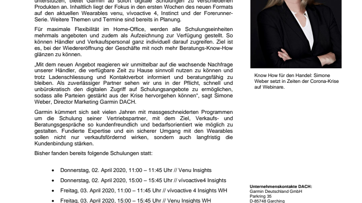 „Mit dem neuen Angebot reagieren wir unmittelbar auf die wachsende Nachfrage unserer Händler, die verfügbare Zeit zu Hause sinnvoll nutzen zu können und trotz Ladenschliessung und Kontaktverbot informiert und beratungsfähig zu bleiben. Als zuverlässiger Partner sehen wir uns in der Pflicht, schnell und unbürokratisch den digitalen Zugriff auf Schulungsangebote zu ermöglichen, sodass alle Parteien gestärkt aus der Krise hervorgehen können“, sagt Simone Weber, Director Marketing Garmin DACH.