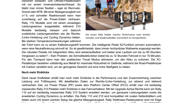 Neuhausen am Rheinfall, 09. September 2025 – Die Rally 110 und 210 Wattmess-Pedalsysteme liefern präzise Leistungsdaten und ermöglichen einen schnellen Wechsel zwischen Strassen- und Offroad-Pedalkörpern mit nur einem Innensechskantschlüssel. So bleibt man immer flexibel – egal ob Rennvelo, Gravel oder MTB. Mit einer Messgenauigkeit von ±1 % und schneller Reaktionszeit kann man zuverlässig auf die Power-Daten vertrauen. Rally 110 Modelle sind mit einem einseitigen Leistungssensor ausgestattet, während 210 Modelle beidseitig messen und dadurch zusätzliche Leistungsmetriken wie die Rechts-/Links-Verteilung und Cycling Dynamics bieten. Bei starken Temperaturschwankungen während der Fahrt kann es zu einem Kalibrierungsdrift kommen. Die intelligente Pedal IQ-Funktion erinnert automatisch, wann eine Neukalibrierung sinnvoll ist. So ist gewährleistet, dass immer hochpräzise Wattwerte angezeigt werden. Die robusten Pedale mit integriertem Akku sind wiederaufladbar und bieten eine Laufzeit von bis zu 90 Stunden. Vergessen zu laden? – Kein Problem, die Schnellladefunktion bietet bis zu 12 Stunden Fahrzeit in nur 15 Minuten. Für den Transport kann man den praktischen Travel Modus aktivieren, um den Akku zu schonen. Die XC-Pedalkörper bestehen vollständig aus Metall für maximale Robustheit im Gelände, während die Road-Pedalkörper mit Carbon verstärkt sind, um ein geringeres Gewicht und eine hohe Steifigkeit zu bieten.