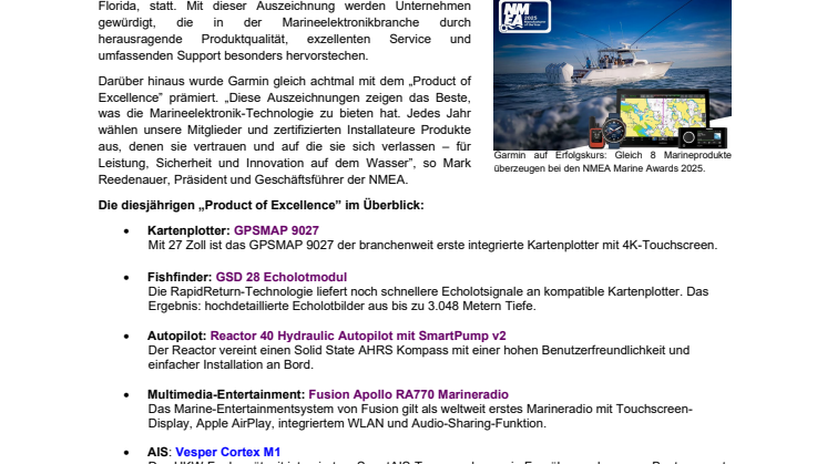 Darüber hinaus wurde Garmin gleich achtmal mit dem „Product of Excellence” prämiert. „Diese Auszeichnungen zeigen das Beste, was die Marineelektronik-Technologie zu bieten hat. Jedes Jahr wählen unsere Mitglieder und zertifizierten Installateure Produkte aus, denen sie vertrauen und auf die sie sich verlassen – für Leistung, Sicherheit und Innovation auf dem Wasser”, so Mark Reedenauer, Präsident und Geschäftsführer der NMEA.