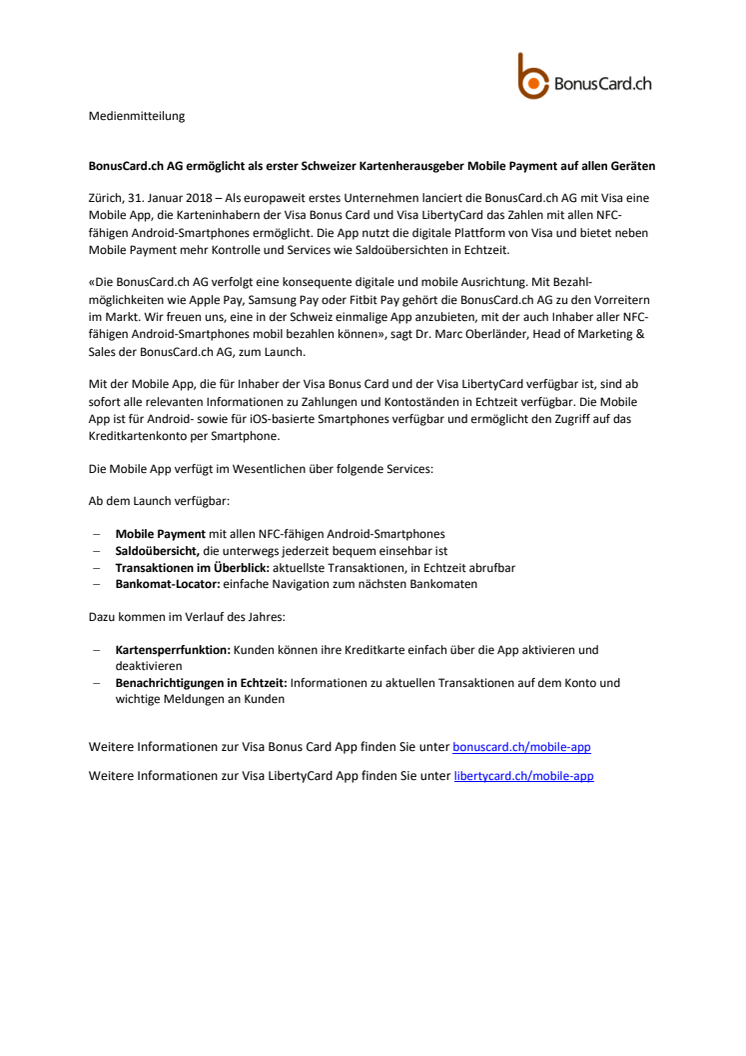 Als europaweit erstes Unternehmen lanciert die BonusCard.ch AG mit Visa eine Mobile App, die Karteninhabern der Visa Bonus Card und Visa LibertyCard das Zahlen mit allen NFC-fähigen Android-Smartphones ermöglicht. Die App nutzt die digitale Plattform von Visa und bietet neben Mobile Payment mehr Kontrolle und Services wie Saldoübersichten in Echtzeit.