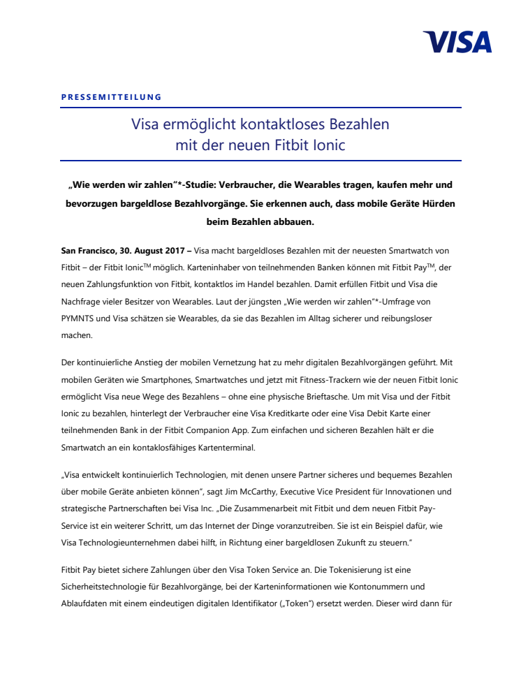 Visa ermöglicht kontaktloses Bezahlen mit der neuen Fitbit Ionic