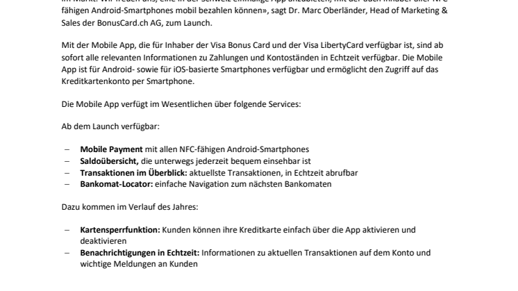 Mit der Mobile App, die für Inhaber der Visa Bonus Card und der Visa LibertyCard verfügbar ist, sind ab sofort alle relevanten Informationen zu Zahlungen und Kontoständen in Echtzeit verfügbar. Die Mobile App ist für Android- sowie für iOS-basierte Smartphones verfügbar und ermöglicht den Zugriff auf das Kreditkartenkonto per Smartphone.
