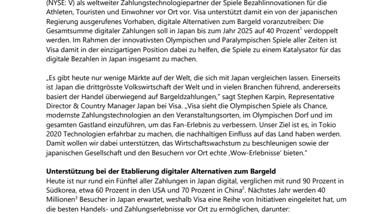 „Es gibt heute nur wenige Märkte auf der Welt, die sich mit Japan vergleichen lassen. Einerseits ist Japan die drittgrösste Volkswirtschaft der Welt und in vielen Branchen führend, andererseits basiert der Handel überwiegend auf Bargeldzahlungen,” sagt Stephen Karpin, Representative Director & Country Manager Japan bei Visa. „Visa sieht die Olympischen Spiele als Chance, modernste Zahlungstechnologien an den Veranstaltungsorten, im Olympischen Dorf und im gesamten Gastland einzuführen, um das Fan-Erlebnis zu verbessern. Unser Ziel ist es, in Tokio 2020 Technologien erfahrbar zu machen, die nachhaltigen Einfluss auf das Land haben werden. Damit wollen wir dabei unterstützen, das Wirtschaftswachstum zu beschleunigen sowie der japanischen Gesellschaft und den Besuchern vor Ort echte ‚Wow-Erlebnisse‘ bieten.“