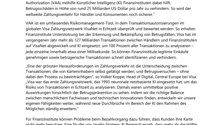 „Eine der grössten Herausforderungen im Zahlungsverkehr ist die Unterscheidung zwischen Transaktionen, die von Karteninhabern selbst getätigt werden, und Betrugsversuchen – ohne dabei den Prozess zu beeinträchtigen“, so Volker Koppe, Head of Digital, Central Europe bei Visa. „Visa war das erste Zahlungsnetzwerk, das 1993 neuronale netzbasierte KI eingesetzt hat, um das Risiko von Transaktionen in Echtzeit zu analysieren. Damals waren unmittelbar positive Auswirkungen hinsichtlich der Betrugsprävention zu sehen. Indem wir die richtige Balance zwischen menschlichem Fachwissen und technischen Innovationen finden, entwickeln wir unsere eigenen Fähigkeiten weiter, während neue Durchbrüche im Bereich der KI den Rahmen des Möglichen ständig erweitern.“