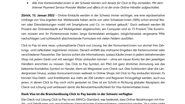 Die Check-out Lösung Click to Pay ist ein EMVCo-Standard, was bedeutet, dass Online-Bezahlungen mit Kredit- und Debitkarten von verschiedenen internationalen Kartenanbietern unterstützt werden. Visa-seitig steht Click to Pay in der Schweiz nun bereit, so dass Händler die neue Lösung für ihre Konsument:innen aktivieren können.