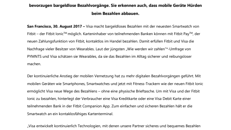 San Francisco, 30. August 2017 – Visa macht bargeldloses Bezahlen mit der neuesten Smartwatch von Fitbit– der Fitbit IonicTMmöglich. Karteninhaber von teilnehmenden Banken können mit Fitbit PayTM, der neuen Zahlungsfunktion von Fitbit, kontaktlos im Handel bezahlen. Damit erfüllen Fitbit und Visa die Nachfrage vieler Besitzer von Wearables. Laut der jüngsten „Wie werden wir zahlen“*-Umfrage von PYMNTS und Visa schätzen sie Wearables, da sie das Bezahlen im Alltag sicherer und reibungsloser machen.