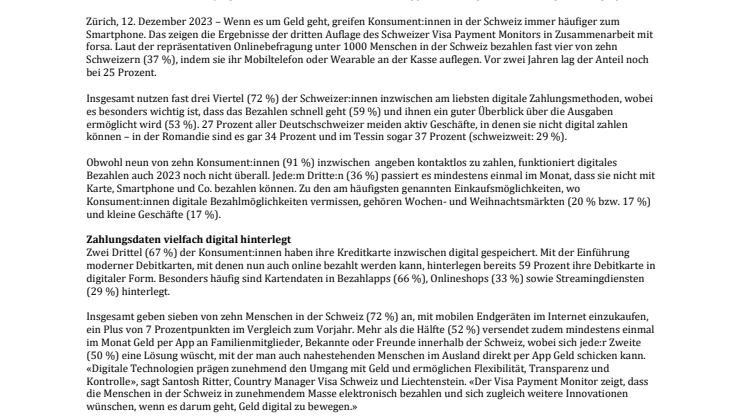 Zürich, 12. Dezember 2023 – Wenn es um Geld geht, greifen Konsument:innen in der Schweiz immer häufiger zum Smartphone. Das zeigen die Ergebnisse der dritten Auflage des Schweizer Visa Payment Monitors in Zusammenarbeit mit forsa. Laut der repräsentativen Onlinebefragung unter 1000 Menschen in der Schweiz bezahlen fast vier von zehn Schweizern (37%), indem sie ihr Mobiltelefon oder Wearable an der Kasse auflegen. Vor zwei Jahren lag der Anteil noch bei 25 Prozent.