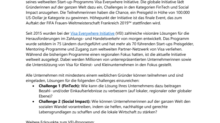Seit 2015 wurden bei der Visa Everywhere Initiative (VEI) zahlreiche visionäre Lösungen für die Herausforderungen im Zahlungs- und Handelsverkehr von morgen entwickelt. Das Programm wurde seitdem in 75 Ländern durchgeführt und hat mehr als 70 führenden Start-ups Preisgelder, Mentoring-Programme und Zugang zum weltweiten Partner-Netzwerk von Visa verliehen. Während die bisherigen Programme einen regionalen Fokus hatten, ist die aktuelle Initiative weltweit ausgelegt. Dabei werden Millionen von unterrepräsentierten Unternehmerinnen sowie die Unterstützung von Visa für Kleinst- und Kleinunternehmen in den Fokus gestellt.