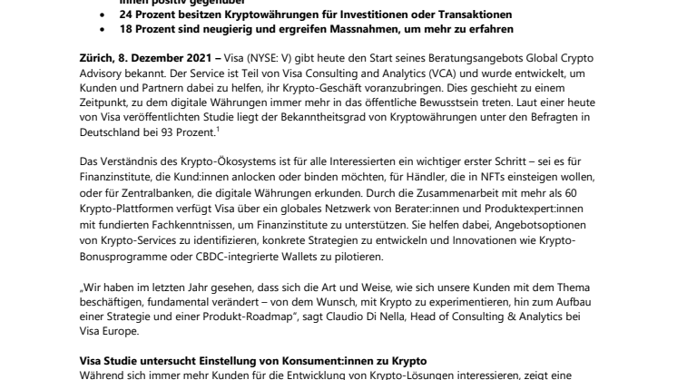 Zürich, 8. Dezember 2021 – Visa (NYSE: V) gibt heute den Start seines Beratungsangebots Global Crypto Advisory bekannt. Der Service ist Teil von Visa Consulting and Analytics (VCA) und wurde entwickelt, um Kunden und Partnern dabei zu helfen, ihr Krypto-Geschäft voranzubringen. Dies geschieht zu einem Zeitpunkt, zu dem digitale Währungen immer mehr in das öffentliche Bewusstsein treten. Laut einer heute von Visa veröffentlichten Studie liegt der Bekanntheitsgrad von Kryptowährungen unter den Befragten in Deutschland bei 93 Prozent.1
