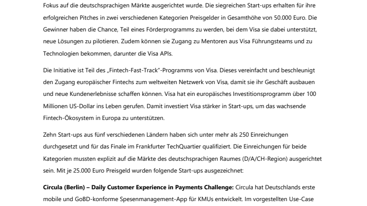 Zürich, 21. September 2018 –Visa (NYSE:V) hat die beiden Berliner Unternehmen Circula und MotionTag als Gewinner des Start-up-Programms Visa’s Everywhere Initiative ausgezeichnet, das zum ersten Mal mit Fokus auf die deutschsprachigen Märkte ausgerichtet wurde. Die siegreichen Start-ups erhalten für ihre erfolgreichen Pitches in zwei verschiedenen Kategorien Preisgelder in Gesamthöhe von 50.000 Euro. Die Gewinner haben die Chance, Teil eines Förderprogramms zu werden, bei dem Visa sie dabei unterstützt, neue Lösungen zu pilotieren. Zudem können sie Zugang zu Mentoren aus Visa Führungsteams und zu Technologien bekommen, darunter die Visa APIs.