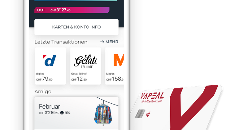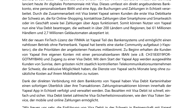 Zürich, 6. Juli 2020 - Yapeal, das erste offiziell von der FINMA lizenzierte Fintech der Schweiz, lanciert heute ihr digitales Portemonnaie mit Visa. Dieses umfasst ein direkt angebundenes Bankkonto, eine personalisierbare IBAN und eine App, die Buchungen und Zahlungen in Echtzeit verarbeitet. Durch die Zusammenarbeit mit Visa bietet Yapeal seinen Kunden die ers-te Visa Debitkarte der Schweiz an, die für Online-Shopping, kontaktlose Zahlungen über Smartphone und Smartwatch oder im Geschäft sowie bei Zahlungen über Apps funktioniert. Somit können Nutzer von Yapeal nun eine Visa Debit beantragen, die weltweit in über 200 Ländern und Regionen, bei 61 Millionen Händlern und 2,7 Millionen Geldautomaten akzep-tiert ist.