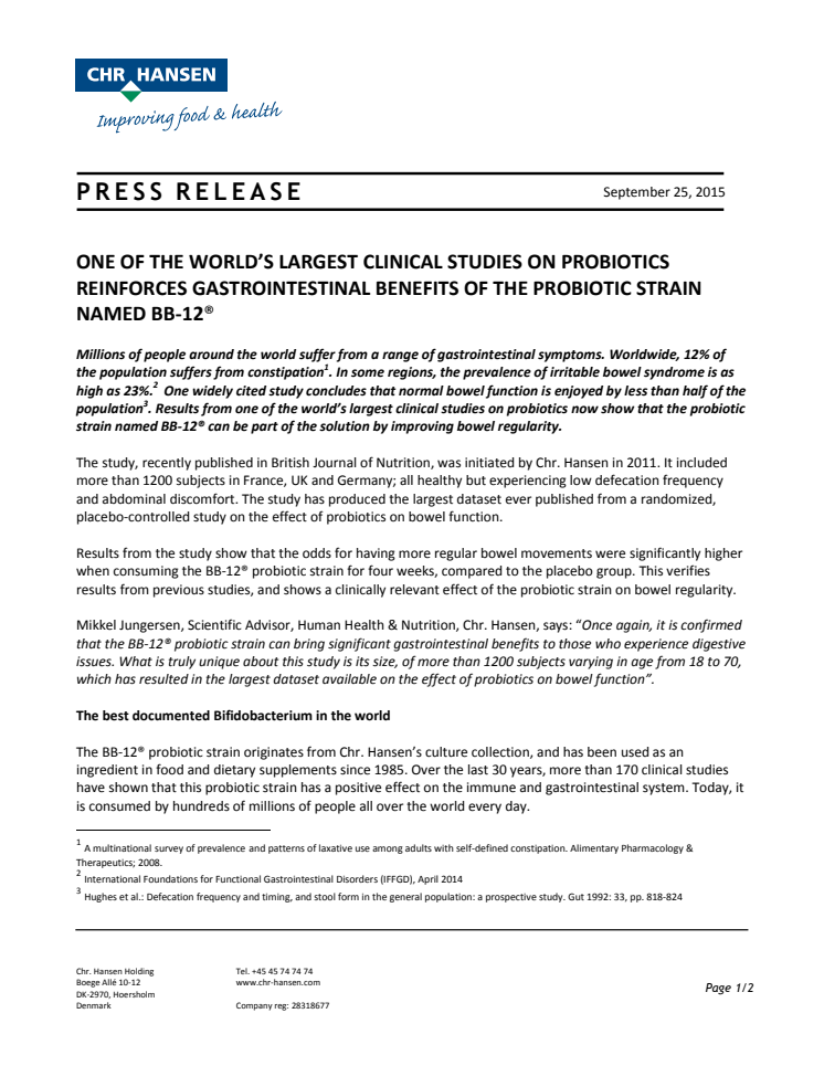 One of the world's largest clinical studies on probiotics reinforces significant gastrointestinal benefits of the probiotic strain named BB-12®