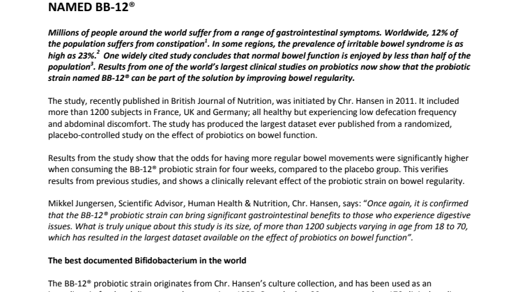 Mikkel Jungersen continues: “We are committed to delivering the best documented probiotics and the BB-12® probiotic strain is the best documented Bifidobacterium in the world. With these new results, it now truly stands out as a strong probiotics within bowel function.”