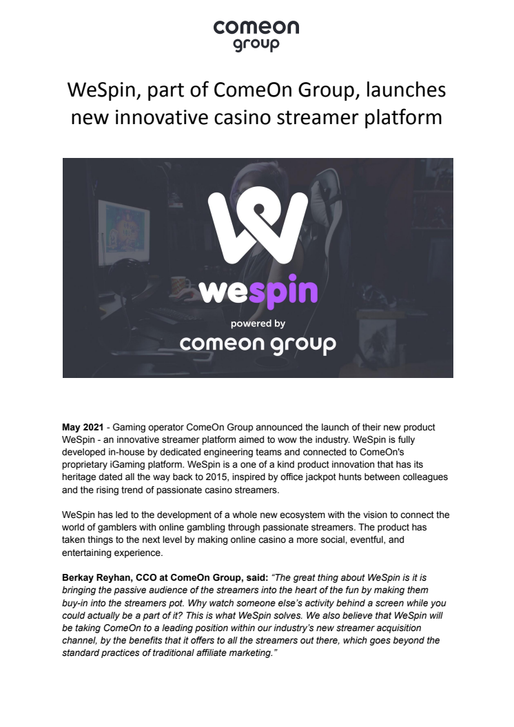 WeSpin, part of ComeOn Group, launches new innovative casino streamer platform