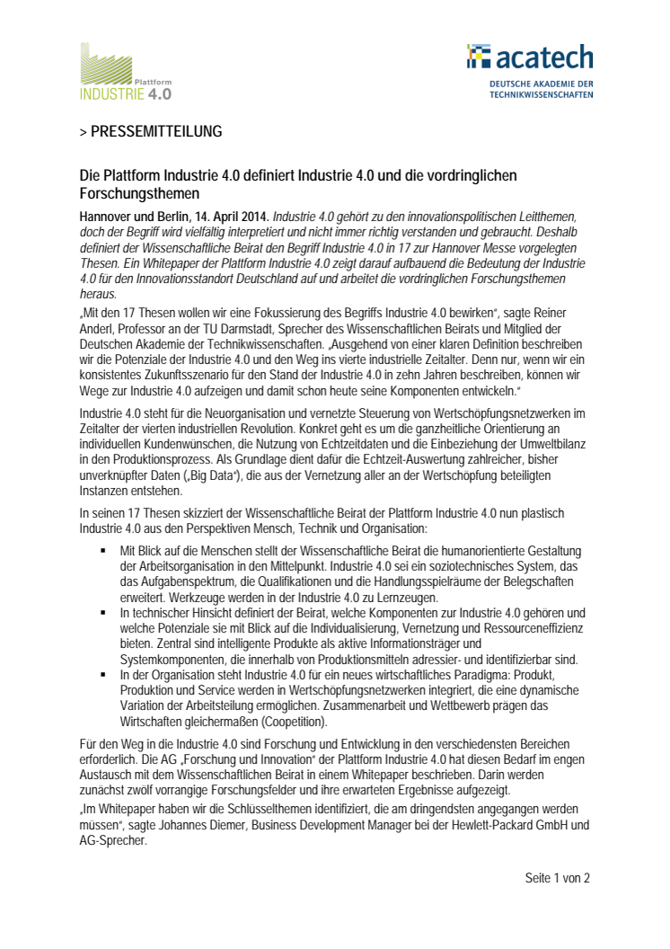 Die Plattform Industrie 4.0 definiert Industrie 4.0 und die vordringlichen Forschungsthemen