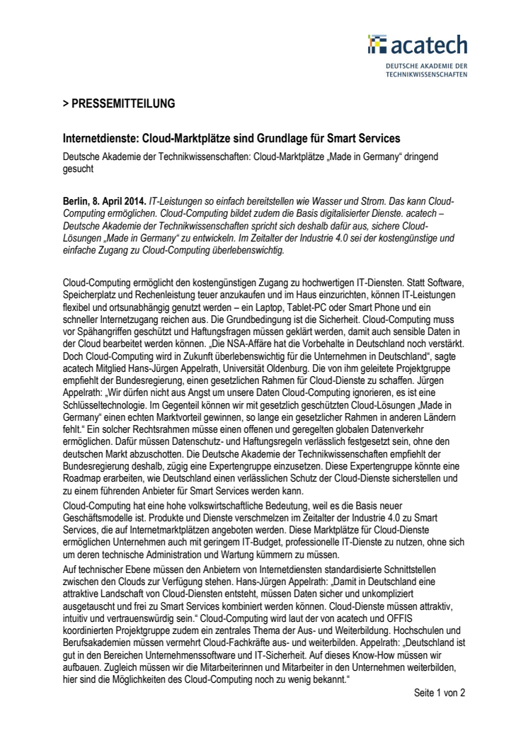 IT-Leistungen so einfach bereitstellen wie Wasser und Strom. Das kann Cloud-Computing ermöglichen. Cloud-Computing bildet zudem die Basis digitalisierter Dienste. acatech spricht sich deshalb dafür aus, sichere Cloud-Lösungen „Made in Germany“ zu entwickeln. Im Zeitalter der Industrie 4.0 sei der kostengünstige und einfache Zugang zu Cloud-Computing überlebenswichtig.