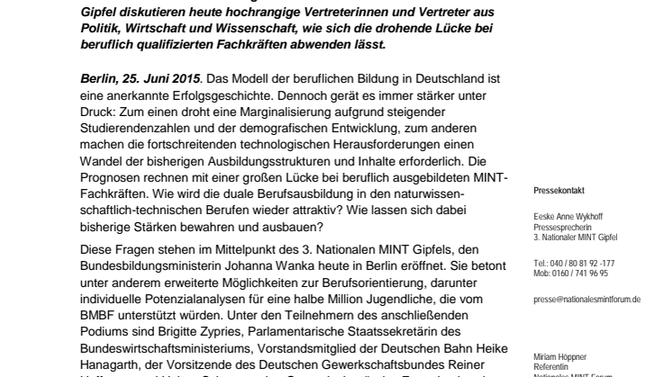 Berufliche Aus- und Weiterbildung sind unverzichtbar für Wettbewerbsfähigkeit, Wertschöpfung und Innovation – doch das deutsche Erfolgs-modell der dualen Ausbildung ist in Gefahr. Beim 3. Nationalen MINT Gipfel diskutieren am 25. Juni in Berlin hochrangige Vertreterinnen und Vertreter aus Politik, Wirtschaft und Wissenschaft, wie sich die drohende Lücke bei beruflich qualifizierten Fachkräften abwenden lässt.